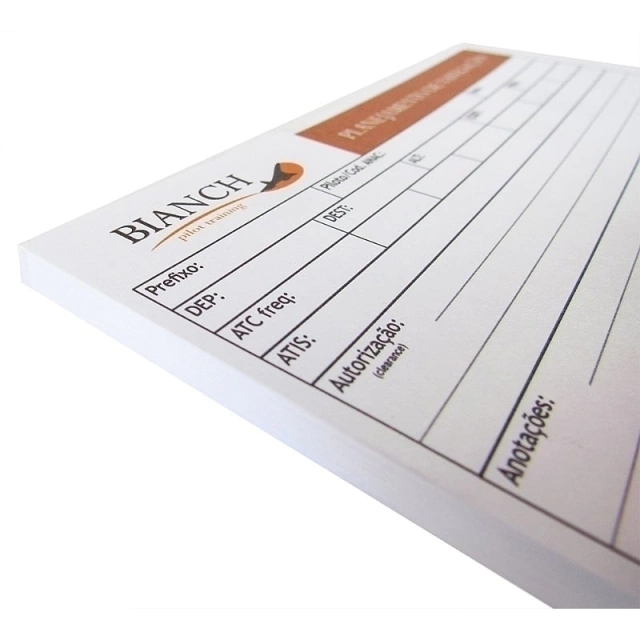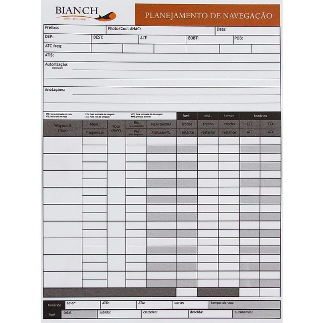 Bloco de fichas para Planejamento de Voo O melhor modo de organizar sua navegação Bloco com 50 fichas contendo campos para a inserção dos dados de sua navegação, tal como estimados, distâncias, proas magnéticas e níveis de voo.
