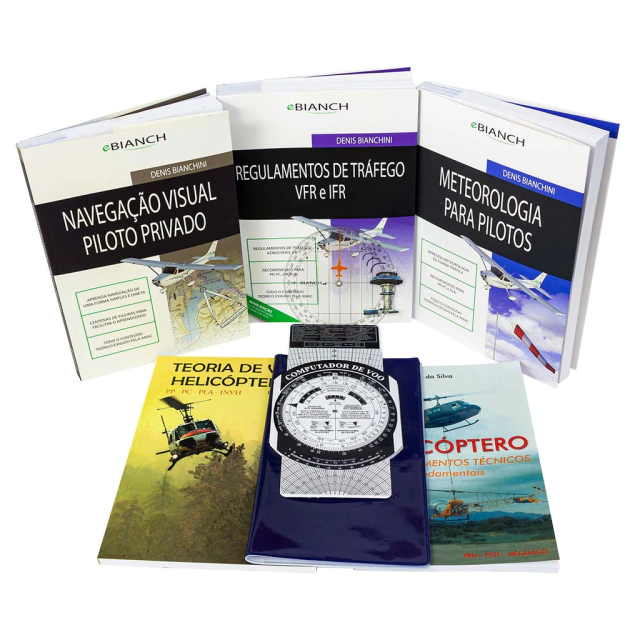Este kit inclui livros e materiais fundamentais, como: - Navegação Visual para Piloto Privado, - Regulamento de Tráfego Aéreo VFR e IFR, - Meteorologia para Piloto Privado e Comercial, - Teoria de Voo Helicóptero do Prof. Rocha, - Computador de Voo E6B da Bianch, - Transferidor Circular de Navegação com cursor, - Conhecimentos Técnicos Helicóptero.