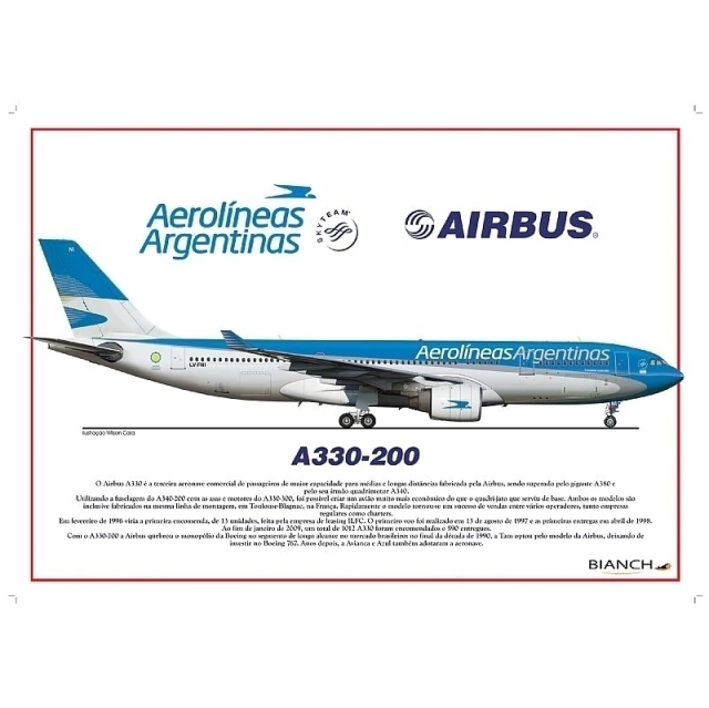 Perfil Airbus A330-200 Aerolíneas Argentinas Painel decorativo com perfil de aeronave comercial Perfil Airbus A330-200 Aerolíneas Argentinas é mas um excelente opção de decoração da Bianch Perfis historicamente perfeitos, que além de serem belos quadros decorativos, também se tornam uma fonte confiável e de referência para pesquisadores, modelistas e entusiastas da aviação. Produção e texto Bianch, assinado pelo artista Wilson Cara Papel Couchê fosco 300 gramas Dimensões: 30 x 42 cm